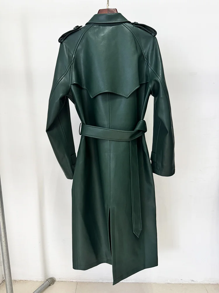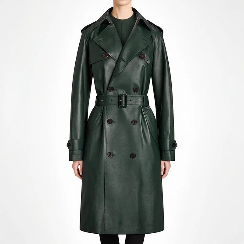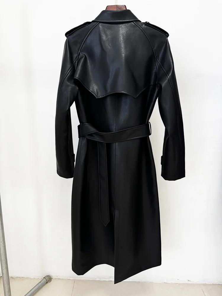 BA2367 Fashion PU Leather Trench Coat Double Breasted Belted Winter Outerwear Elegant Long Jacket with Button Decoration